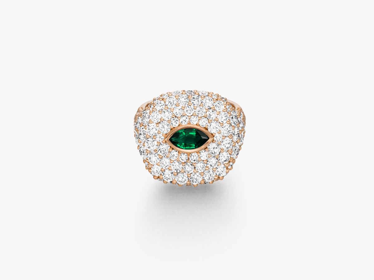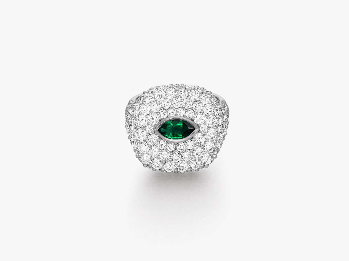 Wie ein Palast aus purem Licht schwebt der "Château de Lumière" auf deinem kleinen Finger – sanft, luxuriös und unendlich bequem. Feinste Diamanten bilden eine makellose, wolkenartige Fläche aus strahlender Brillanz. Im Zentrum funkelt ein Marquise geschliffener Edelstein, ein tiefgrüner Smaragd. Er wirkt wie ein schützendes Auge, ein Tor zur Seele, und verkörpert eine Eleganz, wie man sie selten sieht – zart, erhaben und absolut zeitlos.